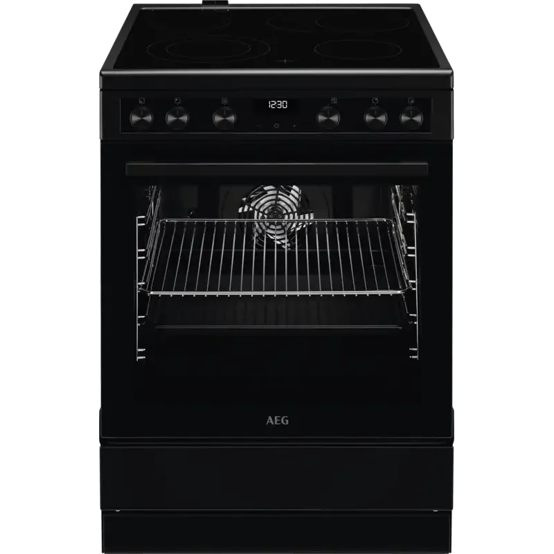 Freestanding hob, electric oven, 73-litre cooking chamber, telescopic guides, pull-out grid for pans, heating modes: grill, convection grill, convection, pizza mode, fan-assisted cooking, pull-out control knobs, display, timer, clock function, glass ceramic hob, 4 cooking zones with ceramic coating, 1 baking zone, 1 double-circuit cooking zone, rapid heating, energy efficiency class A, width: 59.6 cm, height: 85 cm, depth: 60 cm