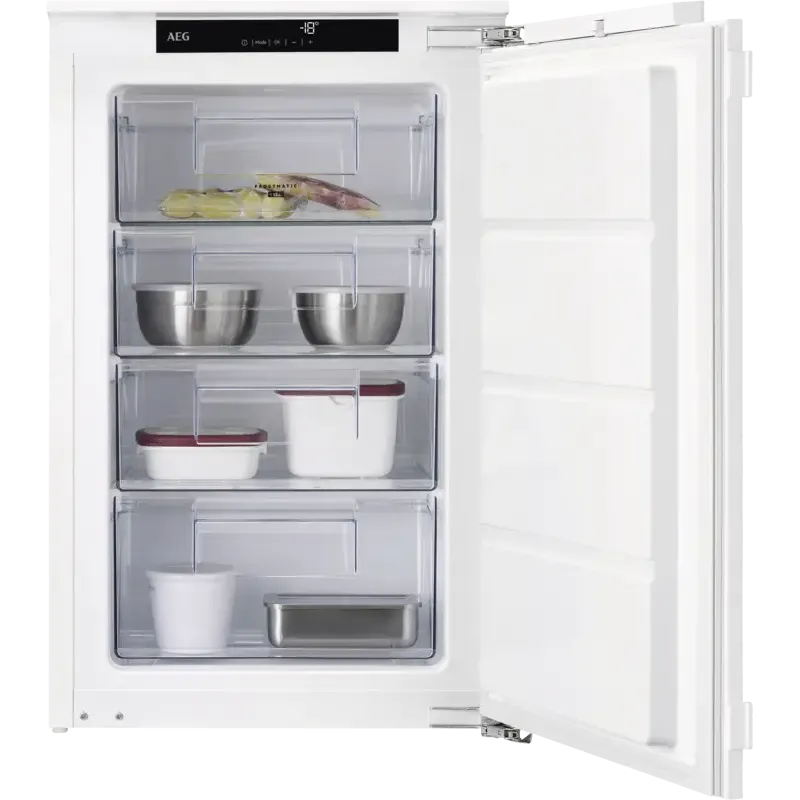 Built-in freezer, fixed door installation, 3 glass shelves, 4 drawers, Flexi-Space system (removable glass shelves in the freezer), super freeze function, display, touch control, digital temperature display, energy efficiency class E, Europe, width: 55.6 cm, height: 87.3 cm, depth: 54.9 cm