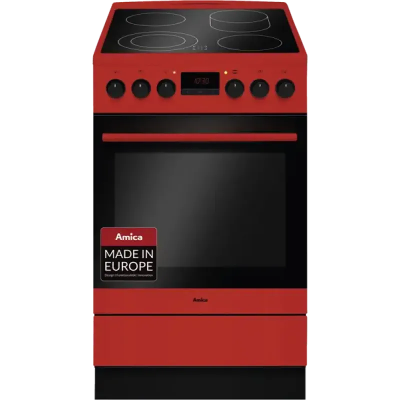 Freestanding hob, electric oven, 65-litre capacity, rapid heating, Steam Clean function (easy cleaning with steam), 2-tier telescopic guides, front panel with heat protection, pull-out grid for dishes, heating modes: defrost, ECO function, infrared grill, intensive grill (grill + top heat), intensive grill with top heat (grill + top heat + fan), convection, pizza mode, convection, pull-out control knobs, display, timer, glass ceramic hob, 4 glass ceramic cooking zones, 1 baking zone, 1 double-circuit cooking zone, rapid heating, energy efficiency class A, width: 50 cm, height: 85 cm, depth: 60 cm