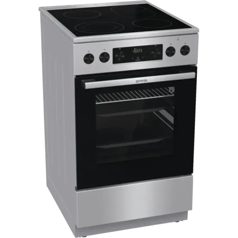 Freestanding electric oven, 70-litre capacity, adjustable temperature up to 275°C, rapid heating, two-stage telescopic guides, oven door with soft-closing mechanism, front panel with heat protection, pizza mode, pull-out control knobs, display, start/stop programming, glass ceramic hob, 4 cooking zones using glass ceramic, 1 baking zone, 1 dual-circuit cooking zone, warming zone, energy efficiency class A, width: 50 cm, height: 85 cm, depth: 59.4 cm