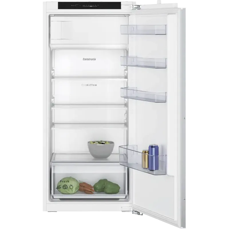 Built-in refrigerator, fully integrated, with a fixed door, refrigerator capacity: 172 l, freezer capacity: 15 l, automatic defrost (refrigerator), super freeze function, 4 glass shelves, 1 fruit/vegetable drawer, LED lighting, energy efficiency class E, width: 54.1 cm, height: 122.1 cm, depth: 54.8 cm