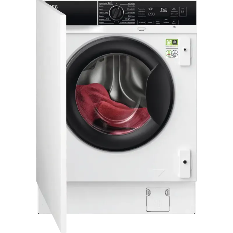 Built-in Washing Machine Design: Suitable for plinth installation, Fully Integrated Door Hinge: Left Door Hinge Performance Specifications Load Capacity: 8 kg Maximum Spin Speed: 1400 rpm Drum Type: ProTex Drum with gentle care Operation Delay Start Reload Function Comfort Display LED Display Program Progress Indicator Remaining Time Display Detergent Addition Built-in Liquid Detergent Dispenser General Features ProSense Technology (saves time, water, and energy) ProSteam Technology (reduces ironing effort for shirts/blouses and gentle care for hand-wash wool items) PowerCare Technology Programs and Options 20 min / 3 kg Refresh Cotton Synthetics Delicate Stain Removal Hygiene Steam Program Jeans Anti-Crease Easy Care PowerClean 59 min Sportswear Extra Rinse DirectSpray Wool/Silk TimeSave SoftPlus (even distribution of fabric softener for softness) General Equipment Automatic Load Sensing Motor: Inverter Motor (brushless, durable, quiet, reliable) Water Protection System: Aquacontrol with alarm Child Lock Product Dimensions (Unpacked) Width: 59.6 cm Height: 81.9 cm Depth: 55.3 cm Weight: 73.5 kg Logistics, including Packaging Width: 64 cm Height: 90 cm Depth: 64 cm Weight: 75 kg EU Label for Household Washing Machines 2019/2014 Energy Efficiency Class on a scale from A to G: Energy Efficiency Class A Weighted Energy Consumption per 100 Eco 40-60 cycles: 47 kWh Rated Capacity for Eco 40-60 program: 8 kg Duration of Eco 40-60 program: 3:20 h:min Weighted Water Consumption per Eco 40-60 cycle: 44 liters Spin-drying Efficiency Class: B Noise Level during Spin: 68 dB(A) Noise Emission Class: Noise Emission Class A