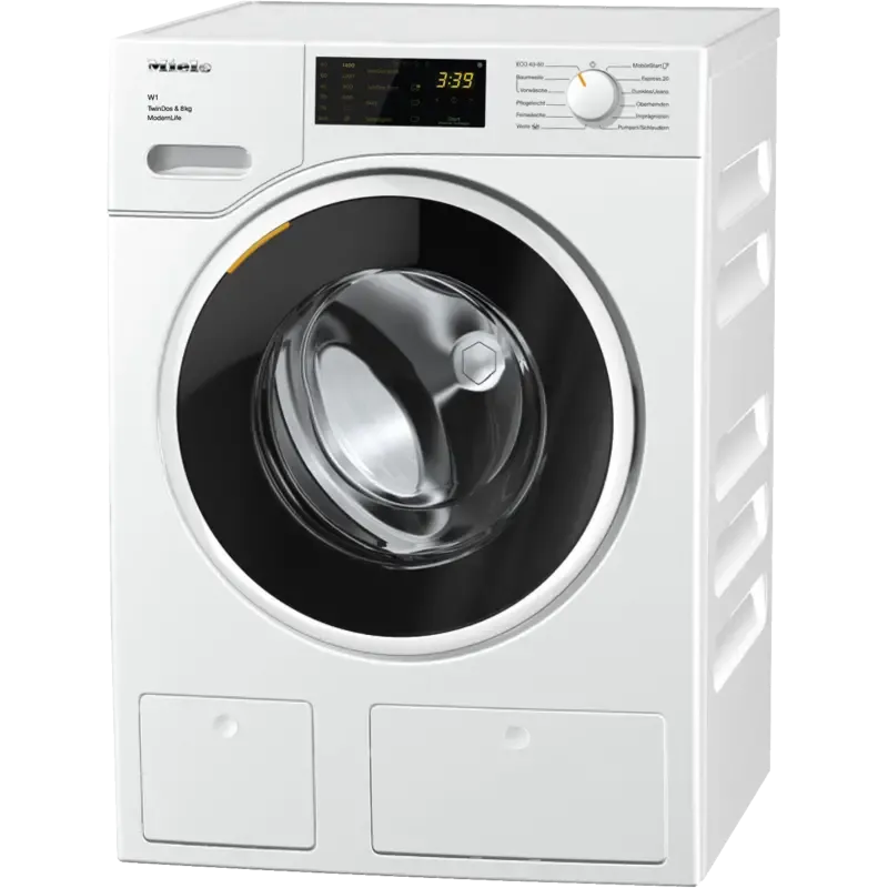 Washing machine, 5° inclined front, 8 kg load, spin speed: maximum 1400 rpm, honeycomb drum, delayed start, AddLoad function (additional laundry load), display, remaining time indicator, AutoClean detergent dispenser (self-cleaning detergent compartment), CapDosing (convenient dosing of special detergent, fabric softener and additives using portioned capsules), TwinDos (automatic dosing with a two-phase system), programs and options: pre-ironing, Eco, water-repellent treatment, low temperature wash, wool wash/hand wash, automatic load adjustment, Eco professional motor (brushless, economical, powerful and durable), Watercontrol, Miele@home (ready for home networking), PIN lock, app transfer, app control, Amazon Alexa compatible, energy efficiency class A, width: 59.6 cm, height: 85 cm, depth: 64.3 cm